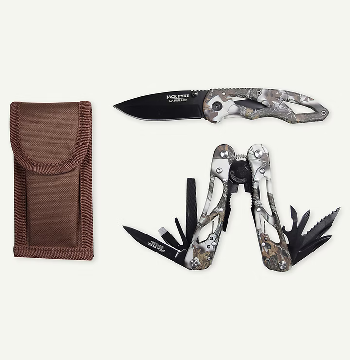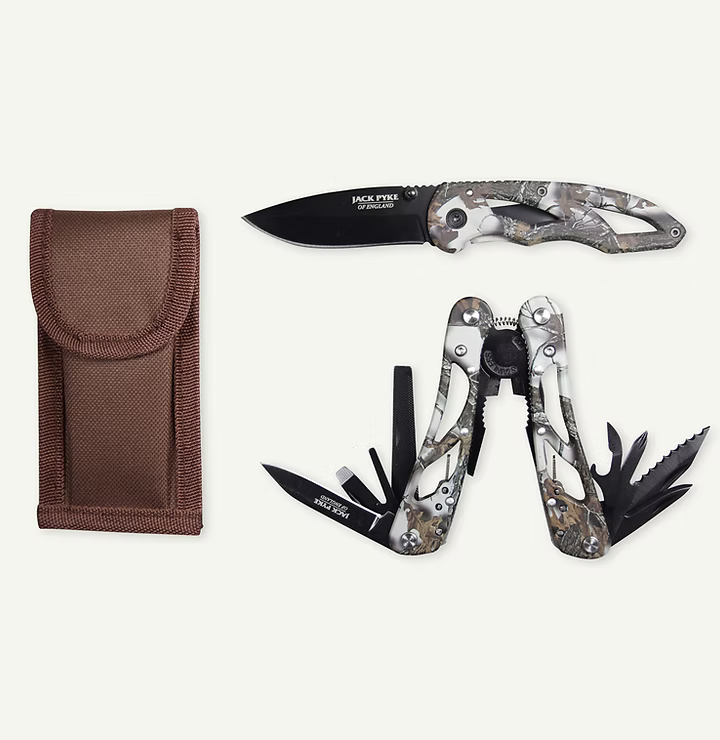 Prepárese para cualquier aventura al aire libre con el juego de multiherramientas y cuchillos Jack Pyke Camo, diseñado para entusiastas de la caza, la pesca, el camping y el senderismo. Esta multiherramienta de acero inoxidable incluye una gama de accesorios, como un cuchillo de sierra, un destornillador, un abrelatas y un abrebotellas, alicates y una navaja, lo que la convierte en un complemento esencial para su equipo de exterior. El juego también incluye un cuchillo de acero inoxidable con bloqueo y una hoja compacta de 7,6 cm, una herramienta de corte versátil y fiable para el campo. Ambas herramientas cuentan con mangos de acero camuflado y una funda protectora de nailon para un transporte seguro y práctico.