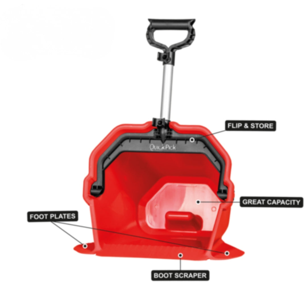 Quick Pick es el resultado de la combinación de innovación, necesidades y diseño. Con Quick Pick, recogerás en la mitad de tiempo que con un recogedor de excrementos convencional. Las bases te permiten mantener el Quick Pick en su lugar mientras recoges y la función de volteo facilita el vaciado. Otras características inteligentes incluyen un raspador de zapatos, un pico vertedor y un asa moldeada y anatómica en la base para facilitar el vaciado. En otras palabras, puedes usar Quick Pick para muchas otras cosas además de recoger, y solo tu imaginación pone los límites.